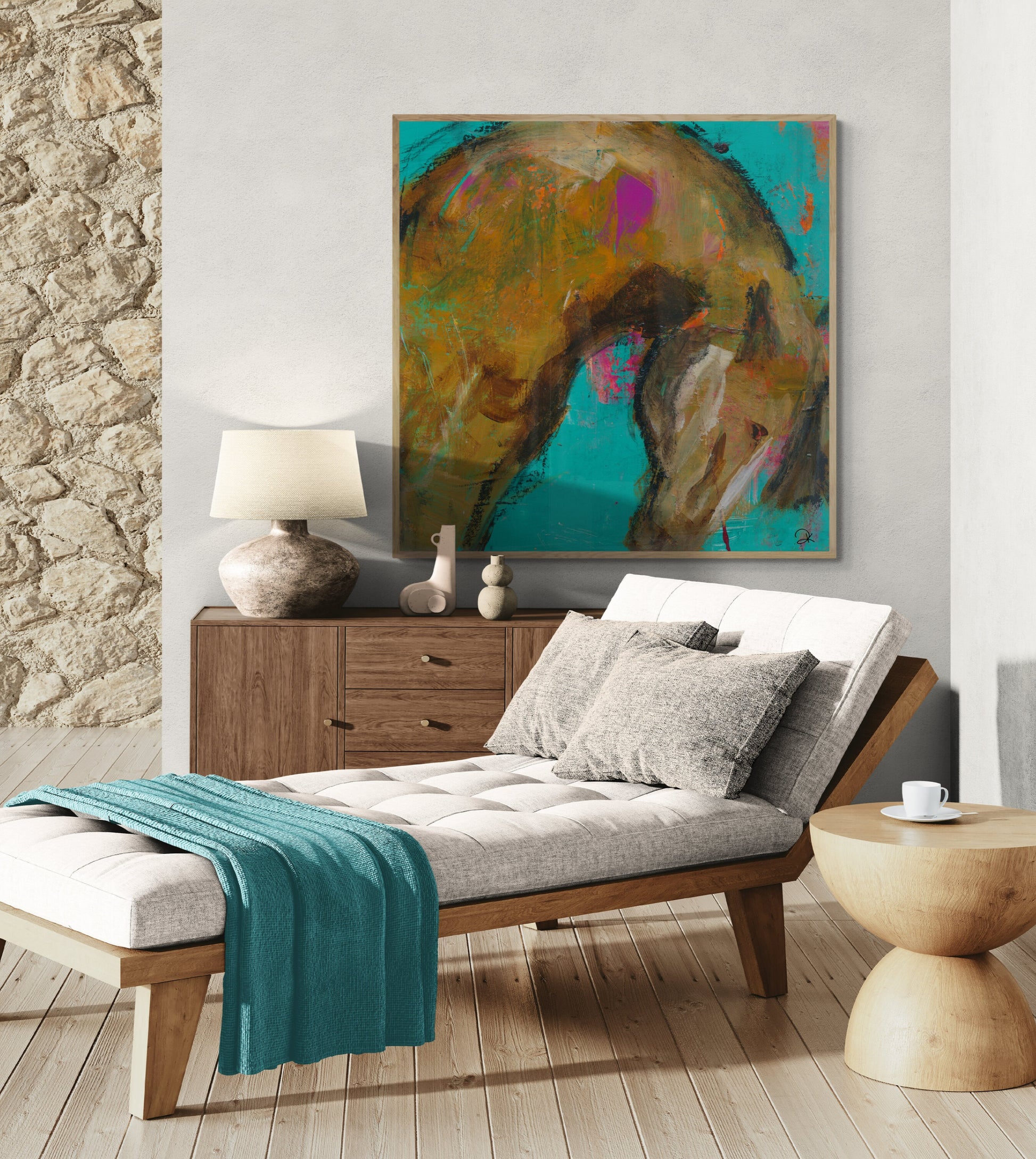 Das Bild zeigt keine Szene – es erzählt einen Moment. Eine Bewegung, eingefroren im Übergang. Der goldene Körper, fast körperlos im Türkis, verweilt wie in Gedanken.